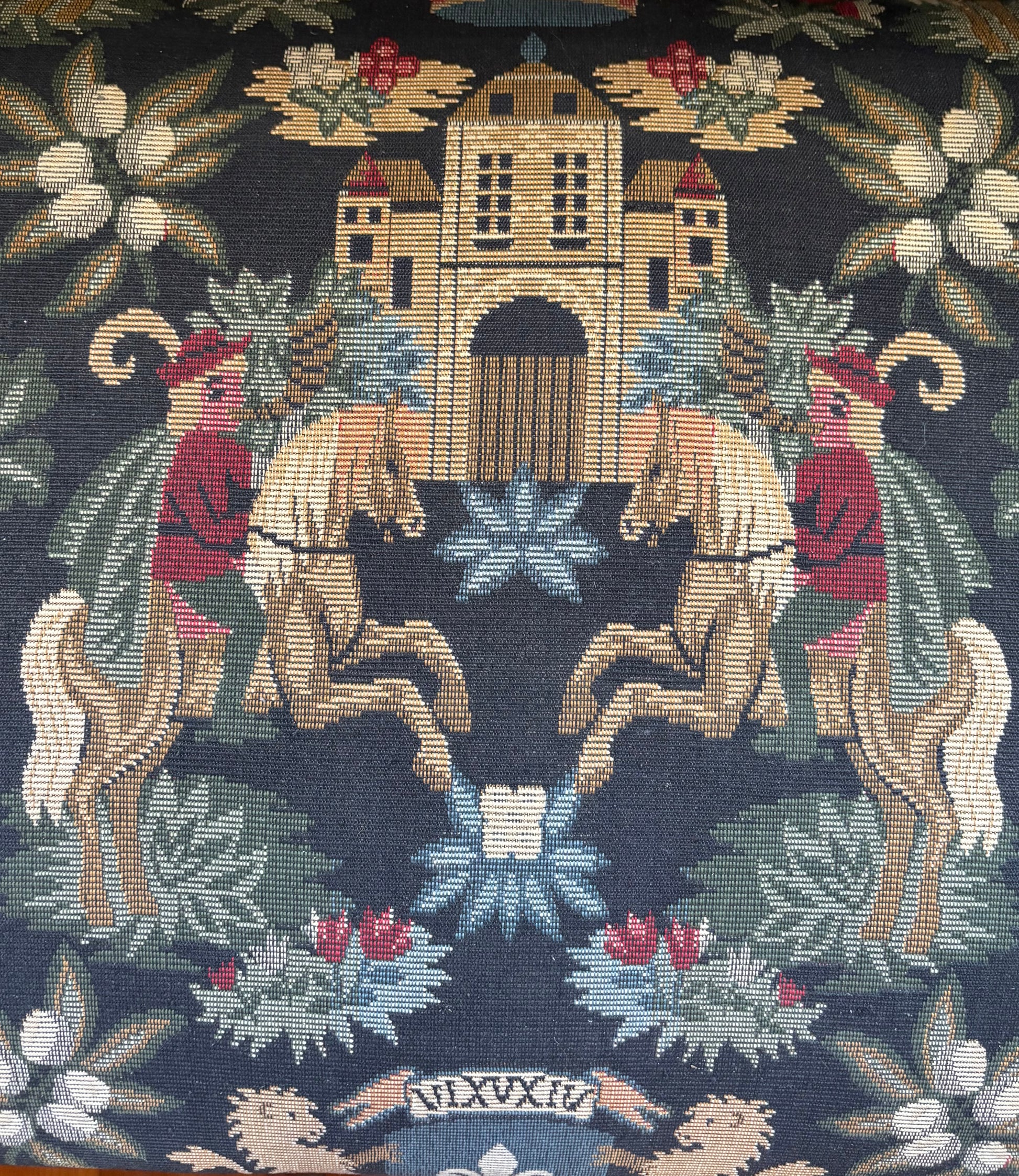 A timeless Treasure has just arrived-this exquisite carved wood settee upholstered in a rich tapestry fabric that feels every bit as regal as it looks. Featuring heraldic motifs of lions, crowns and fluer-de-lis, it brings a sense of history, refinement,and storybook charm into any space.