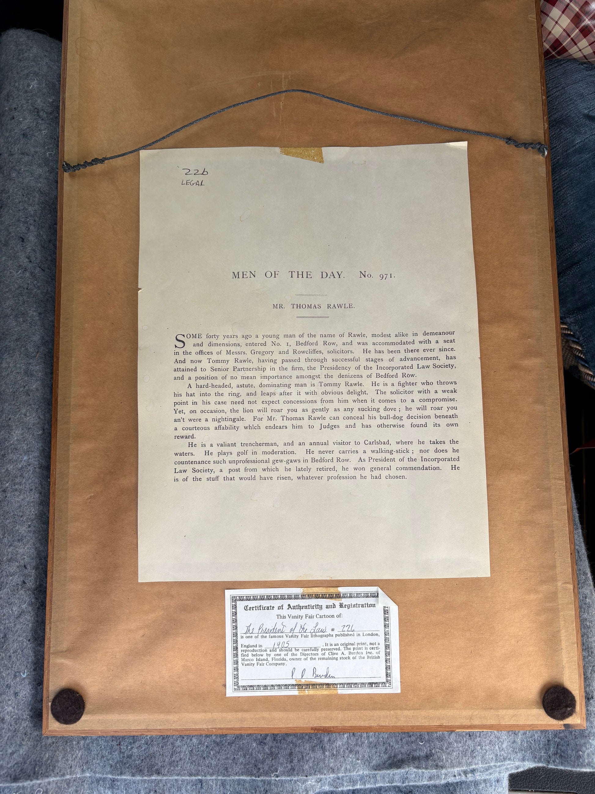 The 1905 "Men Of The Day" British Vanity Fair color chromolithograph caricature offers a vivid glimpse into early 20th-century British society through masterful satirical portraiture. This original print, produced using chromolithography, combines rich color and fine detail to highlight prominent figures of the era with characteristic wit. Collectors and historians will appreciate its historical significance and artistic quality, making it a valuable piece for those interested in period illustration, political satire, and cultural history. Depicts Mr. Thomas Rawle. It is part of the "Men Of The Day" series and specifically titled "The President of Law Society." which Thomas Rawle was at the time. The caricature was created by Sir Leslie Ward(1851-1922) who worked under the pseudonym "spy". It was published in vanity fair on July 6, 1905. Measurements are 13X20.